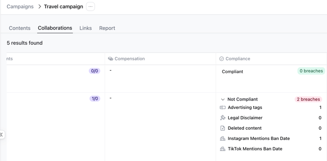 Once your campaign is active, and as Primetag collects each in-feed piece of content, you’ll be able to review the Compliance column within the Contents and Collaborations tabs. This section highlights the number of breaches (if any) and their source.