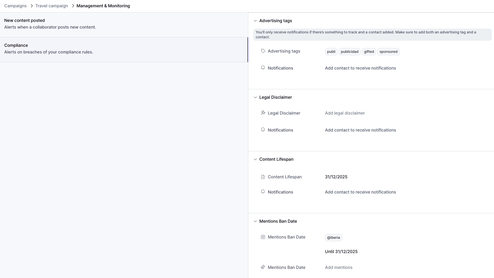 After setting up a campaign for the first time, go to Settings > Management & Monitoring to configure your Compliance Details. Here, you can define the criteria that will be checked daily across all tracked in-feed content: