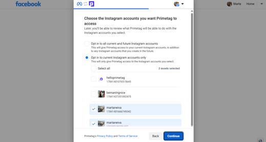 Next, select the professional account linked to your Facebook Page that you want to connect to your Primetag account (it must be your creator / influencer account).