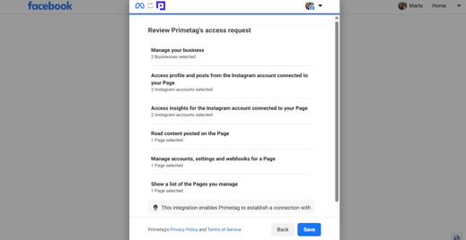 In the next step, Facebook will inform you about the permissions you’re granting to Primetag during registration. You’ll only be sharing follower data and the performance of your posts. The other points refer to your Facebook page, which we don’t use directly; we only need it as a means to establish the connection. We’re Meta partners.