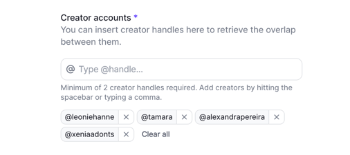 1. Insert Influencer Handles: Copy and paste the handles of the influencers you plan to work with into the designated field. You can analyze the overlap for up to 100 handles.