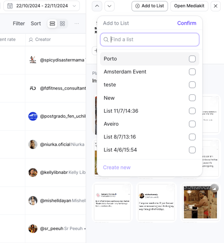 Once you’ve applied your filters, review the influencers' profiles, media kits, and metrics to ensure they align with your goals. Finally, add the ones of your choice to an existing List or create a new one: