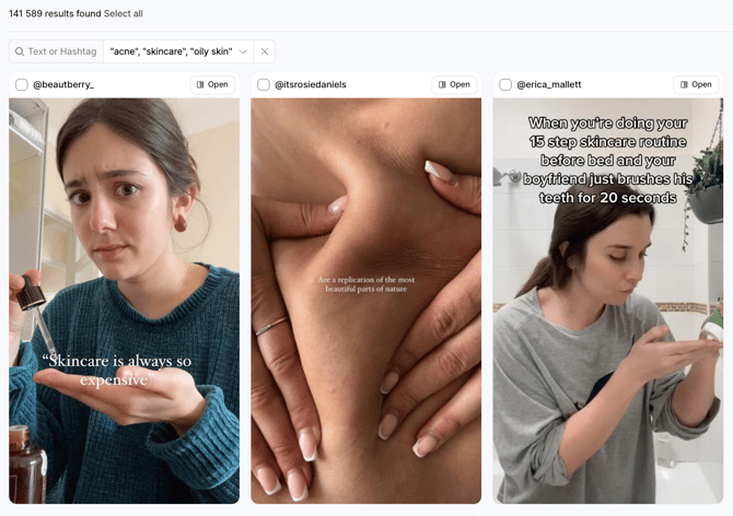 Example: Let’s say you’re a beauty brand launching a new serum for acne-prone skin. You want to collaborate with influencers who focus on skincare or acne-related topics. Here’s how to find them: